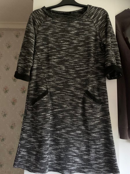 Snygg gråmelerad klänning med svarta detaljer. Klänningen har en rund halsringning och tre fjärdedelsärmar. Den har även två fickor på framsidan.