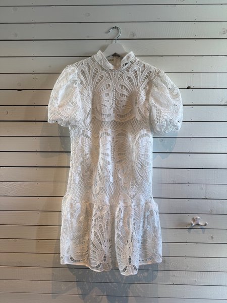 Vit spetsklänning med hög krage och puffärmar. Klänningen har ett detaljerat spetsmönster över hela plagget och en volang nedtill.