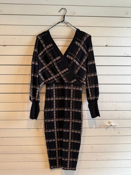 Klänning med långa ärmar och V-ringning. Klänningen har ett rutigt mönster i ljusare nyans. Ärmsluten är ribbade.