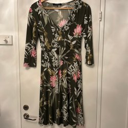 Klänning från Ilse Jacobsen med ett unikt mönster i grå och blå toner. Klänningen har en draperad halsringning och en dekorativ knutdetalj i midjan som skapar en smickrande silhuett. Trekvartsärmar gör den perfekt för både vardag och fest. Klänningen är sparsamt och därför i väldigt fint skick.