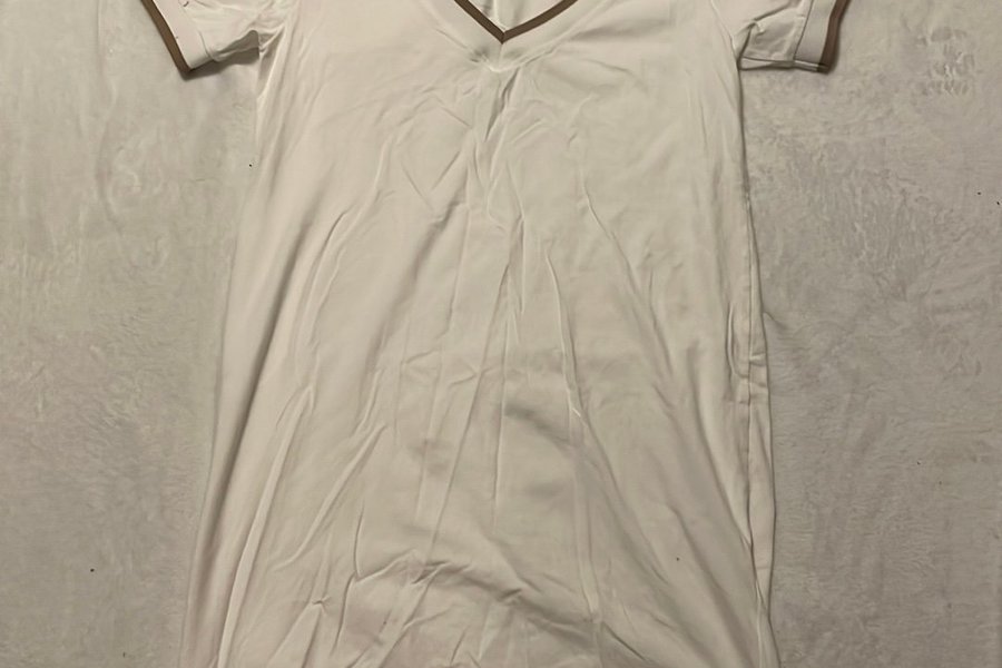 Vit klänning med V-ringning och korta ärmar. Klänningen har en brun kant runt halsringningen, ärmarna och nederkanten.