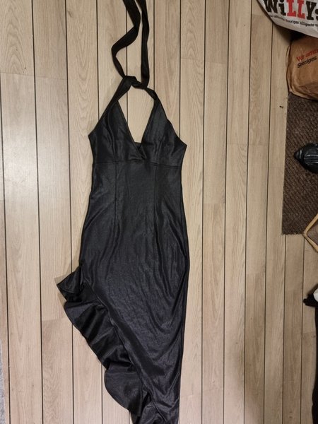 Svart klänning med halterneck och volangdetaljer. Klänningen har en figurnära passform.ett svart glansigt tyg som ger en leather look. En snygg asymmetrisk skärning. Klänningen osar eleganta och stil med en tuff look. Strl M. Ny ej använd.