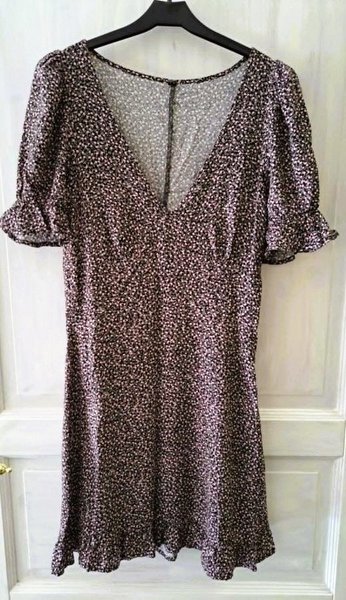 Klänning med v-ringning och korta puffärmar med volang. Klänningen har en volang nedtill.