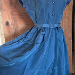Vintage klänning med trekvartsärmar och krage. Klänningen har knappar framtill och ett matchande knytband i midjan. Mönstret är i blåa och gröna nyanser.