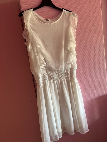 Vit klänning med volanger på ärmarna och resår i midjan. Klänningen har en rund halsringning och är i en lätt och luftig modell.