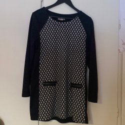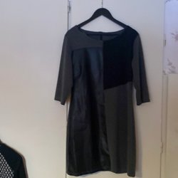 Klänning med kort ärm och rund halsringning. Klänningen har ett mönster som liknar lapptäcke av olika denimtyger i blå nyanser. Passar bra för en avslappnad stil.