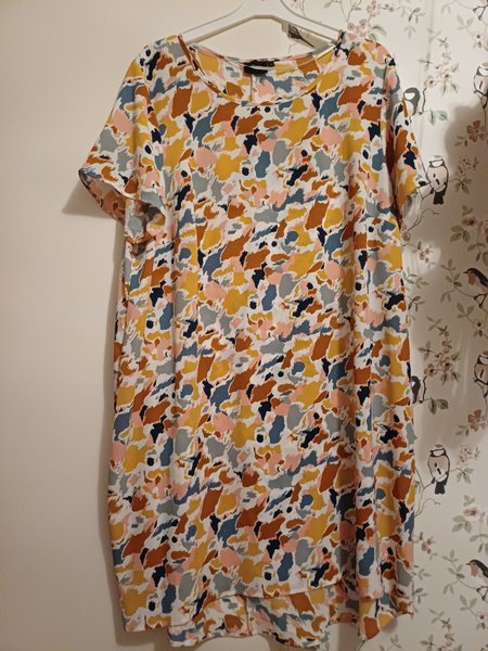 Klänning med ett abstrakt mönster i flera färger. Klänningen har korta ärmar och en rund halsringning. Passformen är rak och avslappnad.