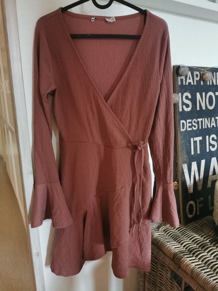 Omlottklänning i en vacker, dämpad rosa färg. Klänningen har långa ärmar med utsvängda ärmslut och knyts i midjan för en smickrande silhuett. Perfekt för både vardag och fest.
