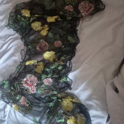 Klänningen har en kamouflagemönstrad design i grå och gröna nyanser. Den har långa ärmar och en huva med dragsko. Passformen är figurnära och klänningen slutar ovanför knät.
