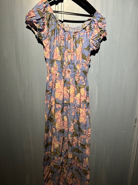 Klänning med blommigt mönster i blått, rosa och grönt. Klänningen har korta puffärmar och en smockad midja. Knappar pryder framsidan från urringningen ner till midjan. Kjoldelen är utsvängd med volanger.