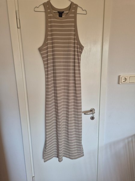 Ribbad klänning i en beige nyans med vita horisontella ränder. Klänningen är ärmlös med rund halsringning och har en figurnära passform