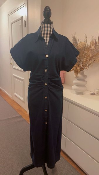 Mörkblå skjortklänning med krage och knappar framtill. Klänningen har korta ärmar och en markerad midja med rynkade detaljer.