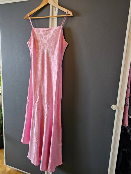 En lång rosa klänning med smala axelband. Klänningen har ett diskret blommigt mönster invävt i tyget och en figurnära passform som övergår i en lätt utsvängd nederdel.