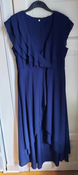 Klänning med omlottdesign och volangdetaljer. Klänningen är ärmlös men med 3 skiktad volangkrage som går ut över axlarna. Kjoldelen är i två skikt med en asymmetrisk nederkant. Dold blixtlås i sidan. Ankellång baktill, vadlång fram. Faller snyggt. Härlig vidd i kjolen.