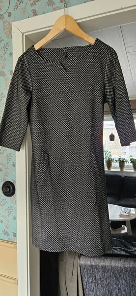 Svart och vit mönstrad klänning med trekvartsärm och fejkfickor fram.
