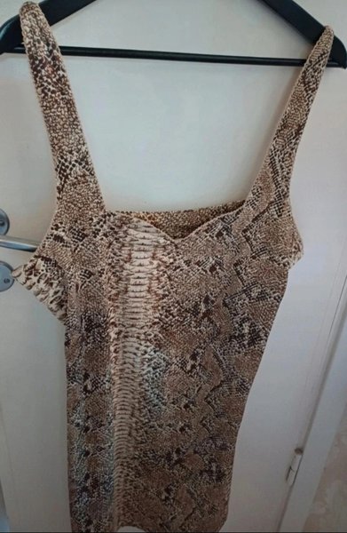 Ett brun klänning med ormskinnsmönster. Klänningen har breda axelband och en lätt v-ringning. Djur finns i hemmet.