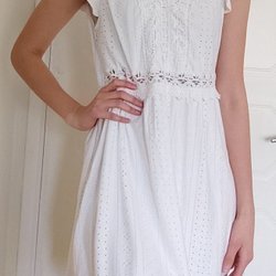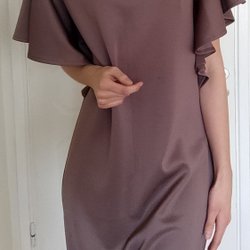 Klänning med plisserad design. Klänningen har långa ärmar med resår vid ärmslut och en rund halsringning med en liten öppning baktill som stängs med en knapp. Överdelen har ett extra lager tyg som skapar en volang-liknande effekt.