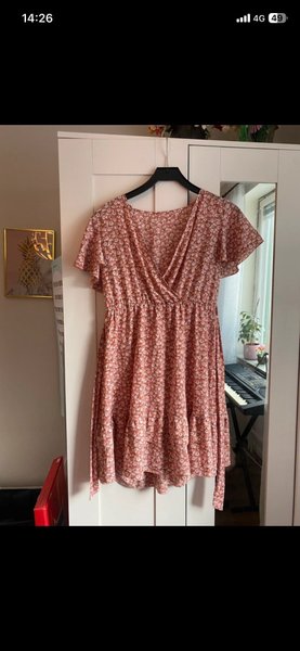 Klänning med blommigt mönster. Klänningen har en omlottdesign upptill och resår i midjan. Ärmarna är korta och volangprydda. Kjoldelen har en volangkant nedtill.