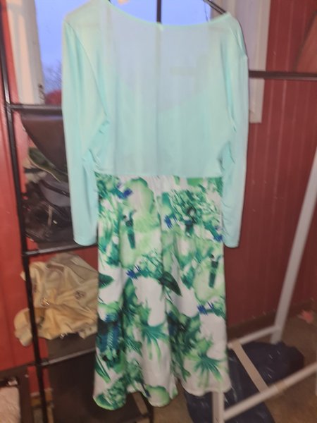 Klänning med långa ärmar och ett vackert mönster nedtill. Klänningen har en ljusgrön färg upptill och ett blommigt mönster i grönt, blått och vitt nedtill. Storlek xxl.