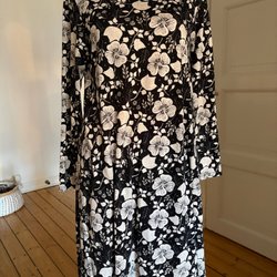 Snygg och unik klänning i svartvitt mönster. Klänningen har långa ärmar och en fin, lite vidd, nederdel. Den har en skjorta-liknande krage. Perfekt för både vardag och festligare tillfällen.