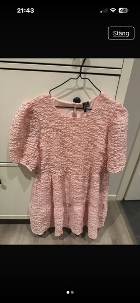 Söt, ljusrosa klänning med puffärmar och en lätt utställd kjol. Klänningen har en rund halsringning och stängs med en knapp i nacken.
