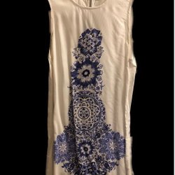 En vacker, mörkgrön klänning med ett unikt mönster som påminner om en persisk matta. Klänningen är ärmslös och har en rak, något A-linjeformad silhuett. Den har en rund halsringning och en bekväm längd. Perfekt för både vardag och fest.