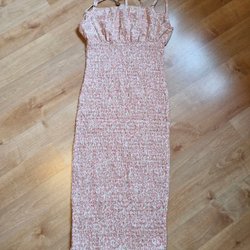 Klänning i en skimrande rosa färg med en markerad midja och ett korsat band på ryggen. St small