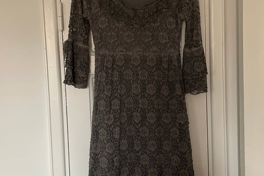 Klänning med långa ärmar och rund halsringning. Klänningen har en figurnära passform upptill och en utsvängd kjol med spetsdetaljer. Ärmarna är utsvängda vid ärmsluten.