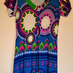 Färgglad klänning med blommigt mönster i blåa och rosa toner. Klänningen har korta ärmar med resår och två praktiska fickor framtill. Stängs med dragkedja baktill. Byst 50, längd 80 cm