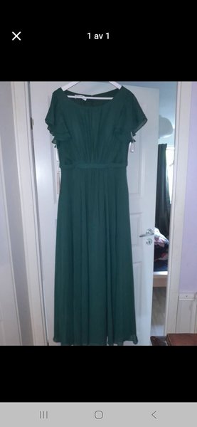 Långklänning i mörkgrön färg med korta ärmar. Klänningen har en rundad halsringning och en markerad midja med veckade detaljer på överdelen och en flödande kjol.