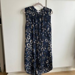 Klänning från Boss Orange i en ljust brun nyans s k taupe. Klänningen har volangdetaljer runt halsringningen och ärmhålen, samt en knappslå framtill med små svarta knappar. Nederkanten är också försedd med en volangkant. Klänningen är ärmlös och har en avslappnad passform.