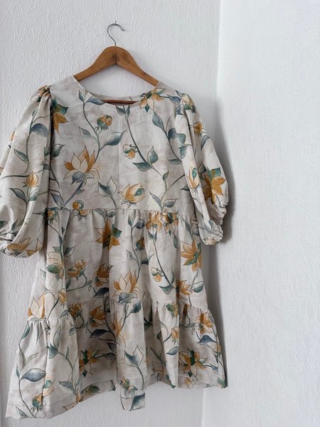 Klänning med blommigt mönster i gult och grönt och lite guld i Klänningen har puffärmar och en volang nedtill.