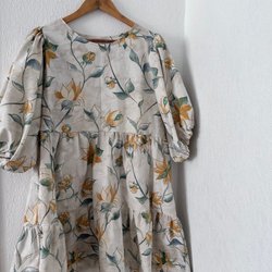 Klänning med volanger och ett blommigt mönster i blått och vitt. Klänningen har en öppen rygg med knytband i nacken och korta ärmar med volangdetaljer. Modellen är lös och bekväm med en markerad midja och en kjoldel i två nivåer.