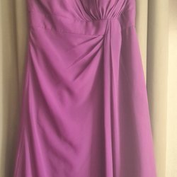Lila klänning med fyrkantig halsringning och breda axelband. Klänningen har ett band i midjan med en söt rosett. Den är fodrad och stängs med dragkedja baktill.
