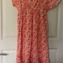Klänning med blommigt mönster. Klänningen har en omlottdesign upptill och resår i midjan. Ärmarna är korta och volangprydda. Kjoldelen har en volangkant nedtill.