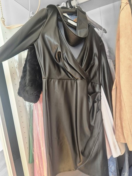 Klänning i svart konstläder med långa ärmar och omlottdesign framtill. Klänningen har en markerad midja och en draperad kjoldel.