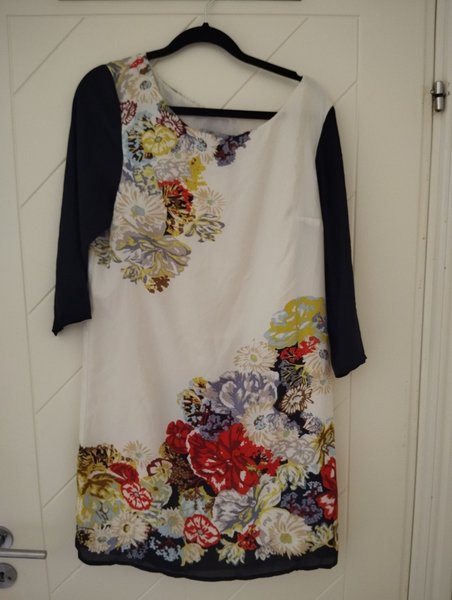 Klänning med långa ärmar och blommigt mönster. Klänningen har en vit bas med stora, färgglada blommor i rött, gult, blått och grönt. Ärmarna är enfärgade i mörkblått.