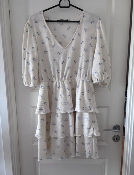Klänning med V-ringning. Klänningen har en markerad midja med resår och en kjoldel med tre volanger. Mönstret består av små blommor. Strl M