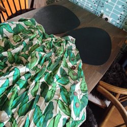 Klänning med korta ärmar och rund halsringning. Klänningen har ett mönster i gult och svart på en vit botten. Kjoldelen är plisserad.