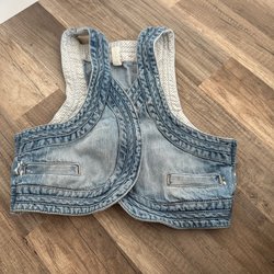 Denimklänning med hängseldesign och justerbara axelband. Klänningen har en ficka på bröstet med en liten reva och en fransig nederkant.