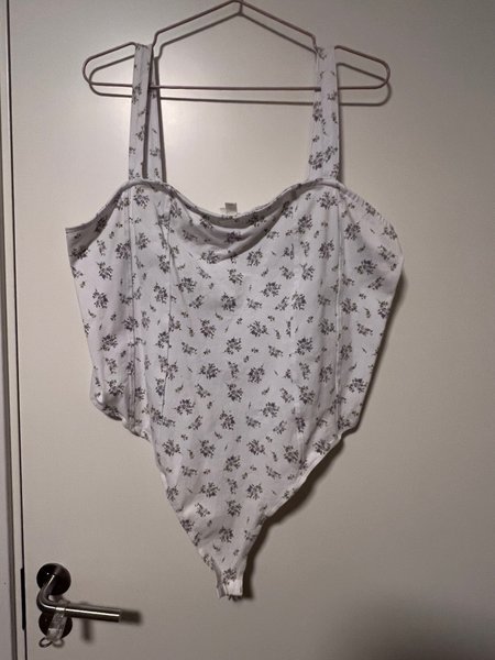 Vit body med blommigt mönster och breda axelband. Användes 2 gånger.