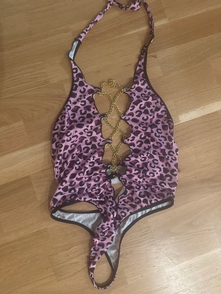 Baddräkt med leopardmönster i rosa och mörklila nyanser. Den har en halterneck-design och guldfärgade kedjor som korsar framtill, vilket skapar utskärningar. Baddräkten har en stringtrosa baktill.