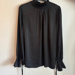 Svart, genomskinlig blus med korta ärmar och en rynkad detalj nedanför bröstet.