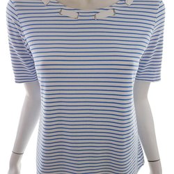 Det asymmetriska snittet och de snygga ränderna ger denna blus en unik touch som kommer att få dig att sticka ut var du än går. Med trekvartsärmar är denna blus perfekt för att bära under varmare dagar eller för att lager-på-lager look under kyligare kvällar.