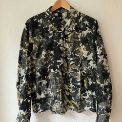 Svart, långärmad blus i ljuvligt tunn och mjuk bomull från Nygårdsanna. Lätt creppat tyg när blusen är nytvättad som ses på bilderna. Väl använd vilket kanske mest märks på att spetsen längs högra framkanten har bleknat annars inget att anmärka på.