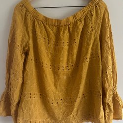 Senapsgul blus med lång ärm och v-ringning. Blusen har en ledig passform och är perfekt för både vardag och fest. Behöver strykas. Stl small. Något nopprig.