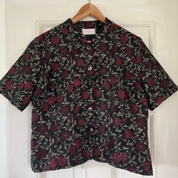 Retro blus med ett unikt mönster med små blad i blått och grönt. Blusen har en elegant knytkrage som ger en sofistikerad touch. Saknar stroleksmärkning. Uppskattas passa storlek small medium.