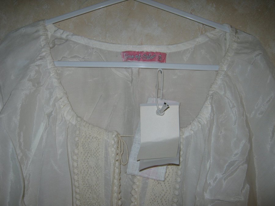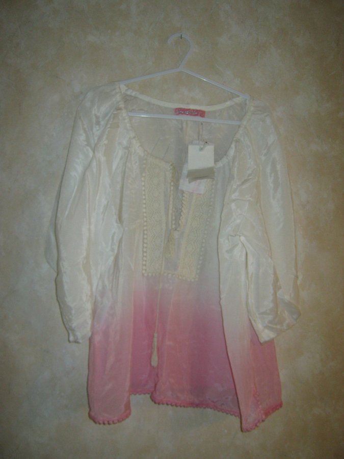 Vit blus med 3/4 långa ärmar och rosa detaljer nedtill. Blusen har en rund halsringning med spetsdetaljer framtill.