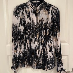 Elegant blus med svarta/silvriga ränder från Gustav. Oanvänd, storlek 34 men mer som 36, Blusen har en v-hals och långa ärmar med manschetter. Den har en avslappnad passform och är perfekt för både vardag och fest.