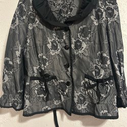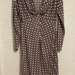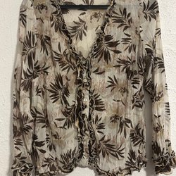 Långärmad chiffongblus med ett paisleymönster i olika nyanser av brunt, vinrött, ljusbrunt och svart. Blusen har knappar framtill och vid ärmslut. Motveck bak.
